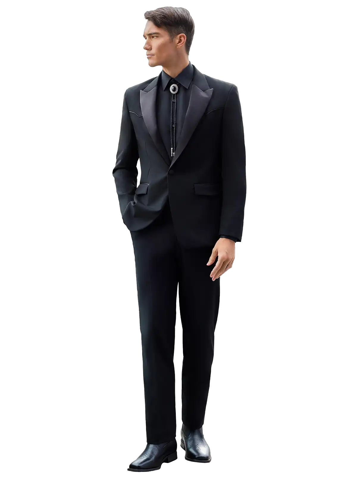 The Ted Stanford Dutton is a trim fit tuxedo featuring 1 button full satin peak lapel. The subtle satin trim on the jacket yoke gives it a true western style. The Dutton can be paired with slim or ultra slim wool or wool stretch trousers. The brand new bolo string tie completes the look.