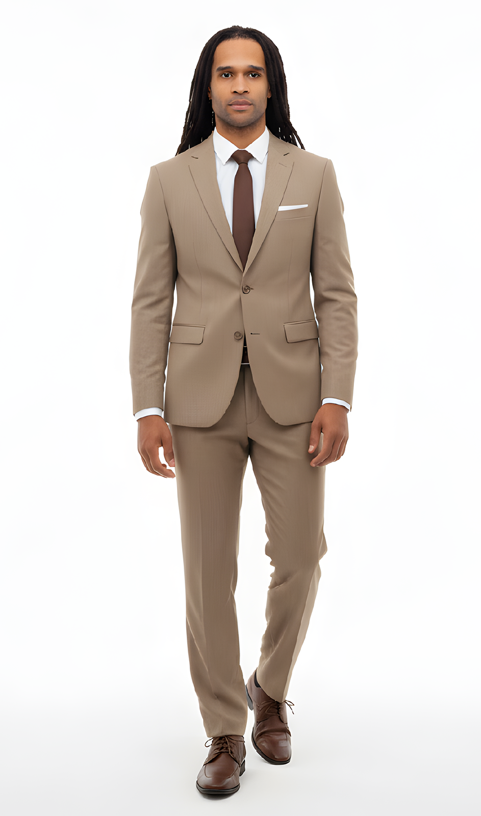 The Ted Stanford Camel Metro is a trim fit suit featuring 2 button jacket, matching trim fit pants and 5 button vest.